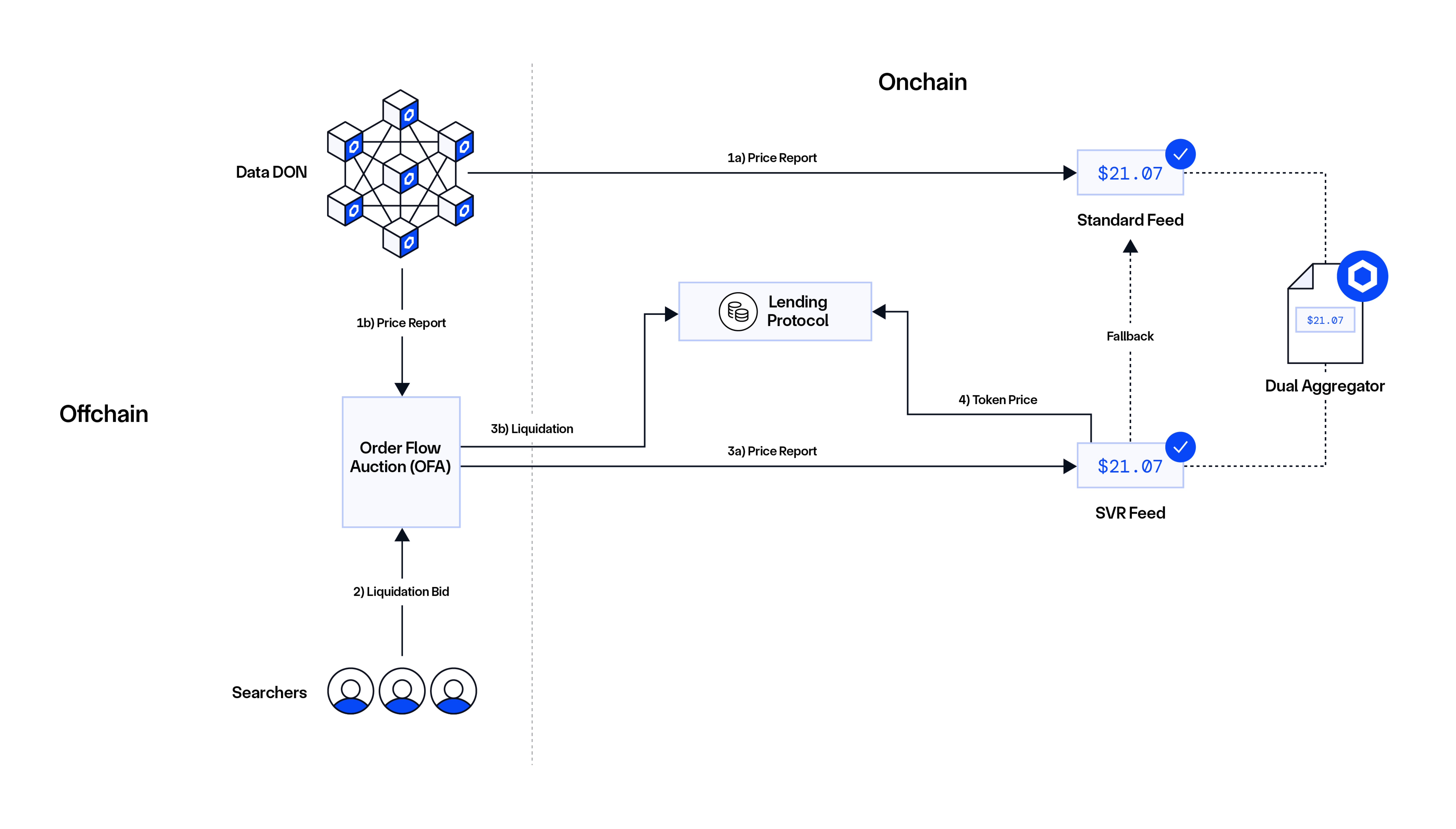 Chainlink Smart Value Recapture (SVR) extends standard Chainlink Price Feeds with an optional private transmission flow. By sending oracle updates through a dual aggregator architecture, SVR enables an auction for the opportunity to backrun liquidations. This approach enables non-toxic MEV recapture, where the DeFi protocol and the Chainlink Network share in the payment offered by the searcher for the right to backrun the liquidation instead of letting it leak entirely to third parties.